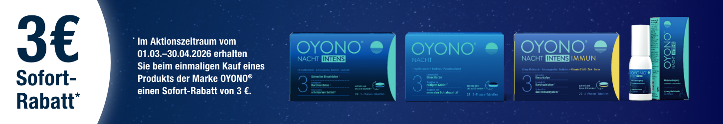 OYONO® sind Nahrungsergänzungsmittel zur Unterstützung eines guten Schlafs1-7. Sie enthalten verschiedenen pflanzlichen Extrakten und Melatonin – ein Stoff, der auch natürlich im Körper produziert wird. Die Produkte von OYONO® können über einen längeren Zeitraum eingenommen werden, da aufgrund der ausgewählten Inhaltsstoffe keine Gewöhnungseffekte zu erwarten sind.